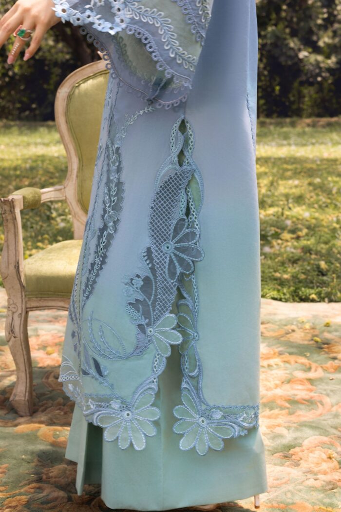 All Things Ombre in the shade Ocean is a bold and artfully crafted 3 piece unstitched suit from the Crimson 2025 collection. The shirt features an embroidered front center panel with laser appliqués on organza paired with embroidered side panels for a structured finish. Both front and back hems are finished with embroidered borders on organza while the back includes an embroidered motif for added dimension.
