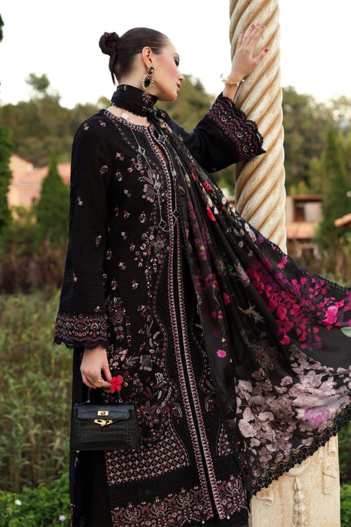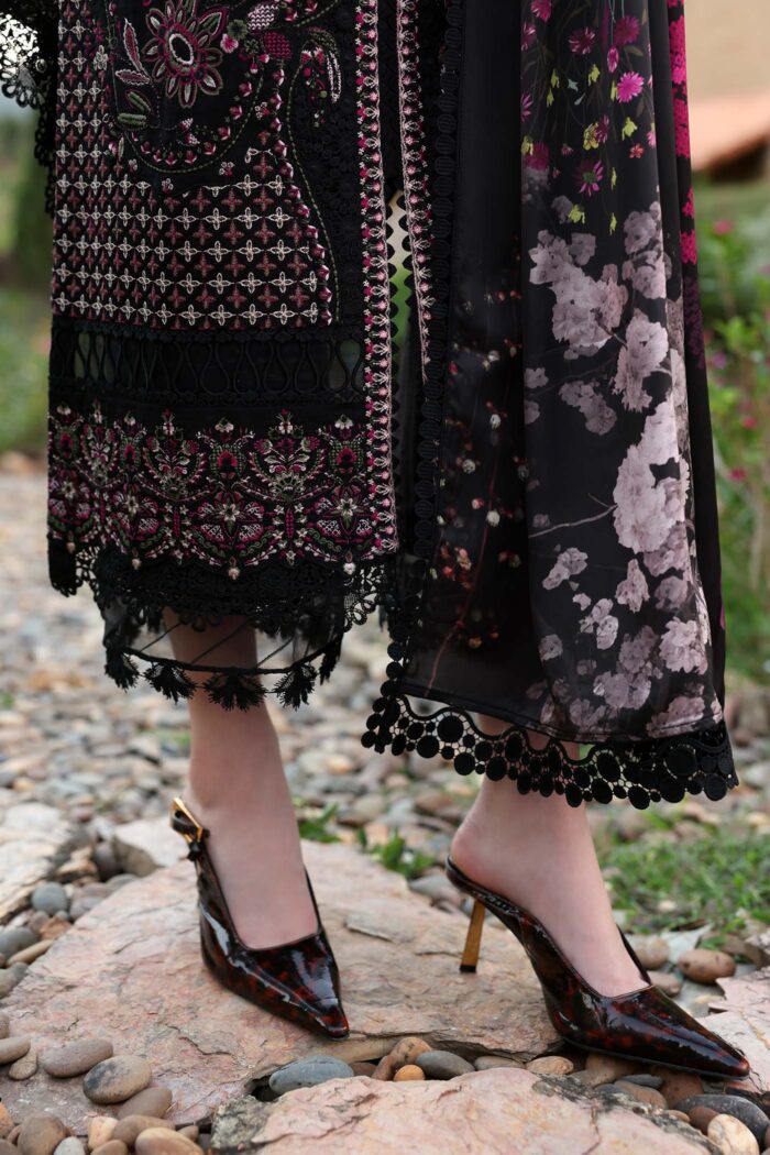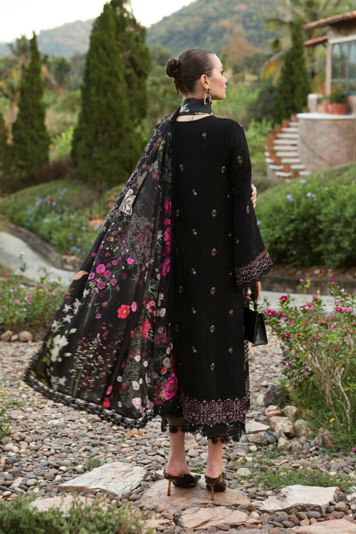 A refined black embroidered jacquard ensemble with Kantha-style embroidery and a printed blended silk dupatta, exuding modern opulence.