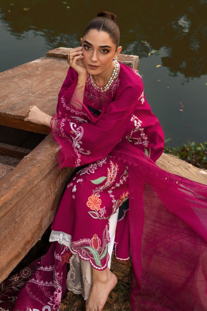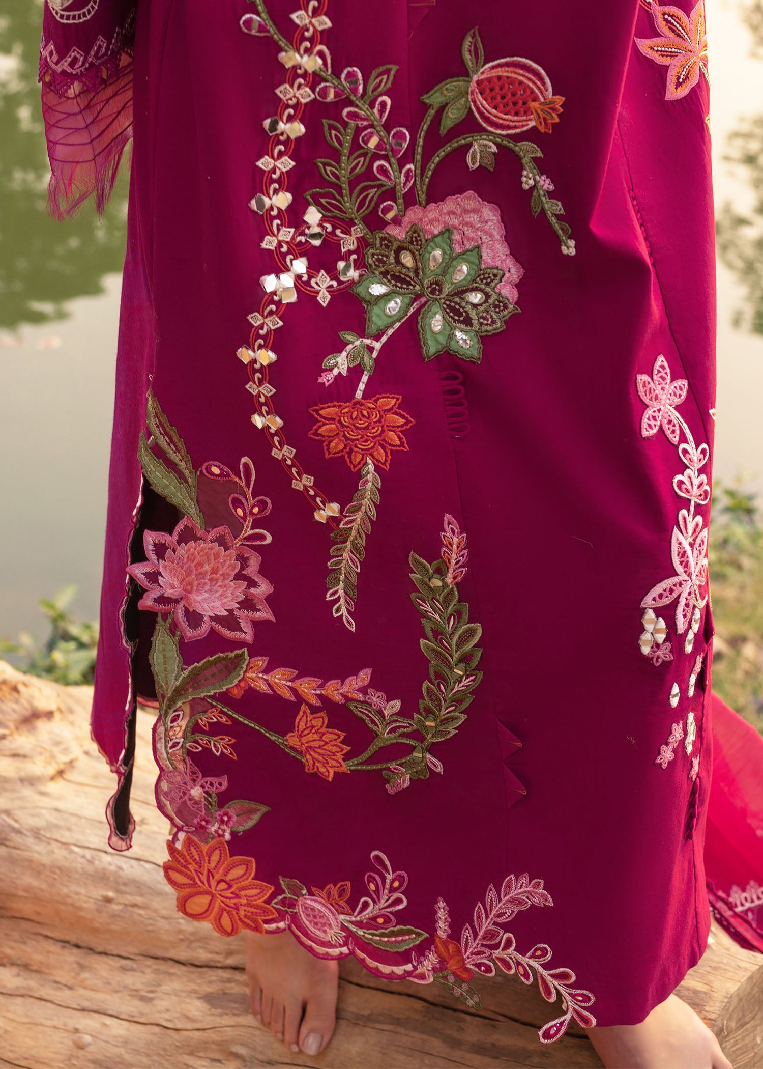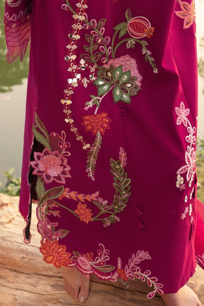 Mirror Garden in Cherry is a striking 3 piece unstitched suit that brings together traditional mirror work and modern craftsmanship in one vivid statement. The front features a fully embroidered center panel with hand appliqués, intricate cutwork, and detailed mirror embellishments, extended into matching embroidered side panels. Sleeves follow the same design language, blending richness with movement.